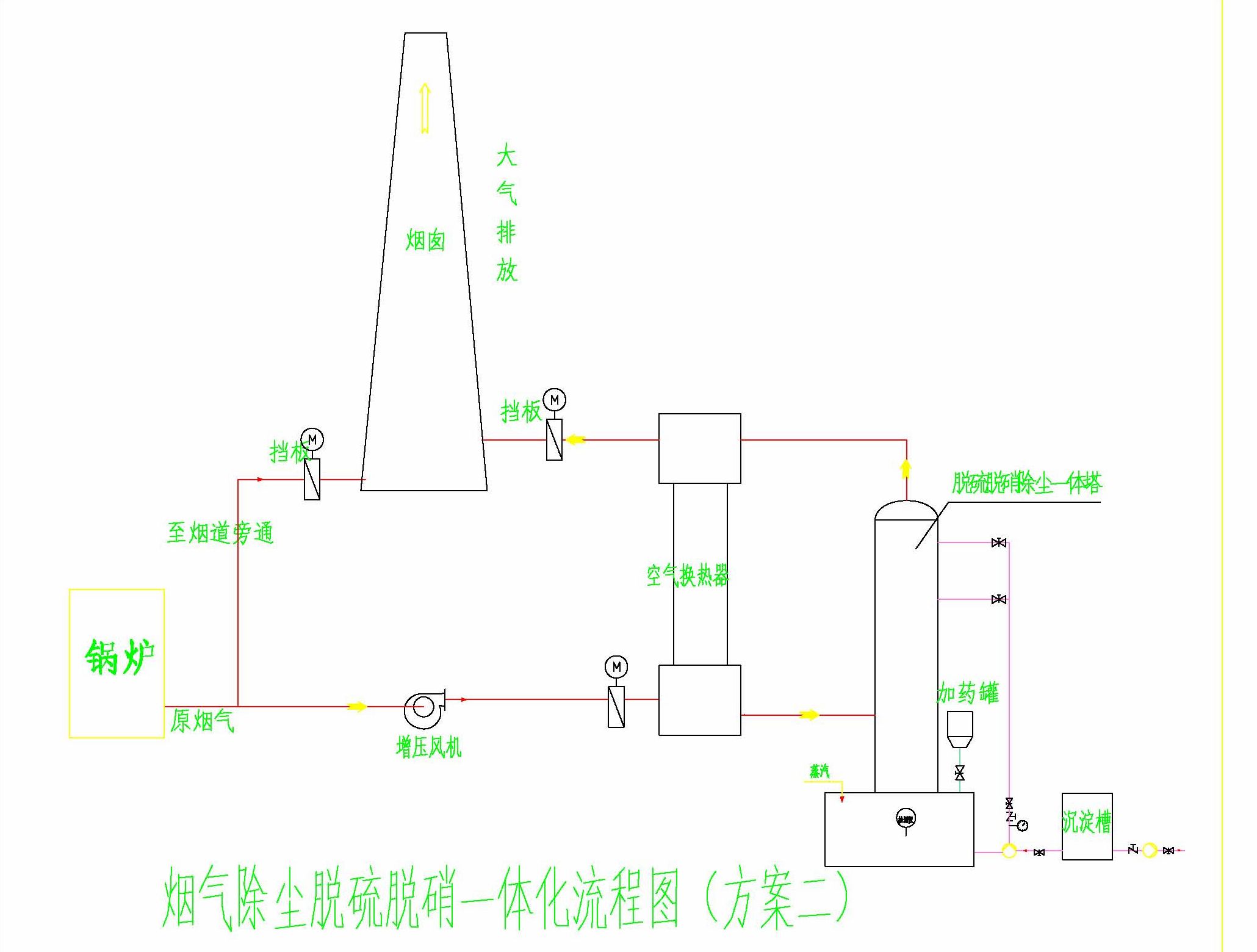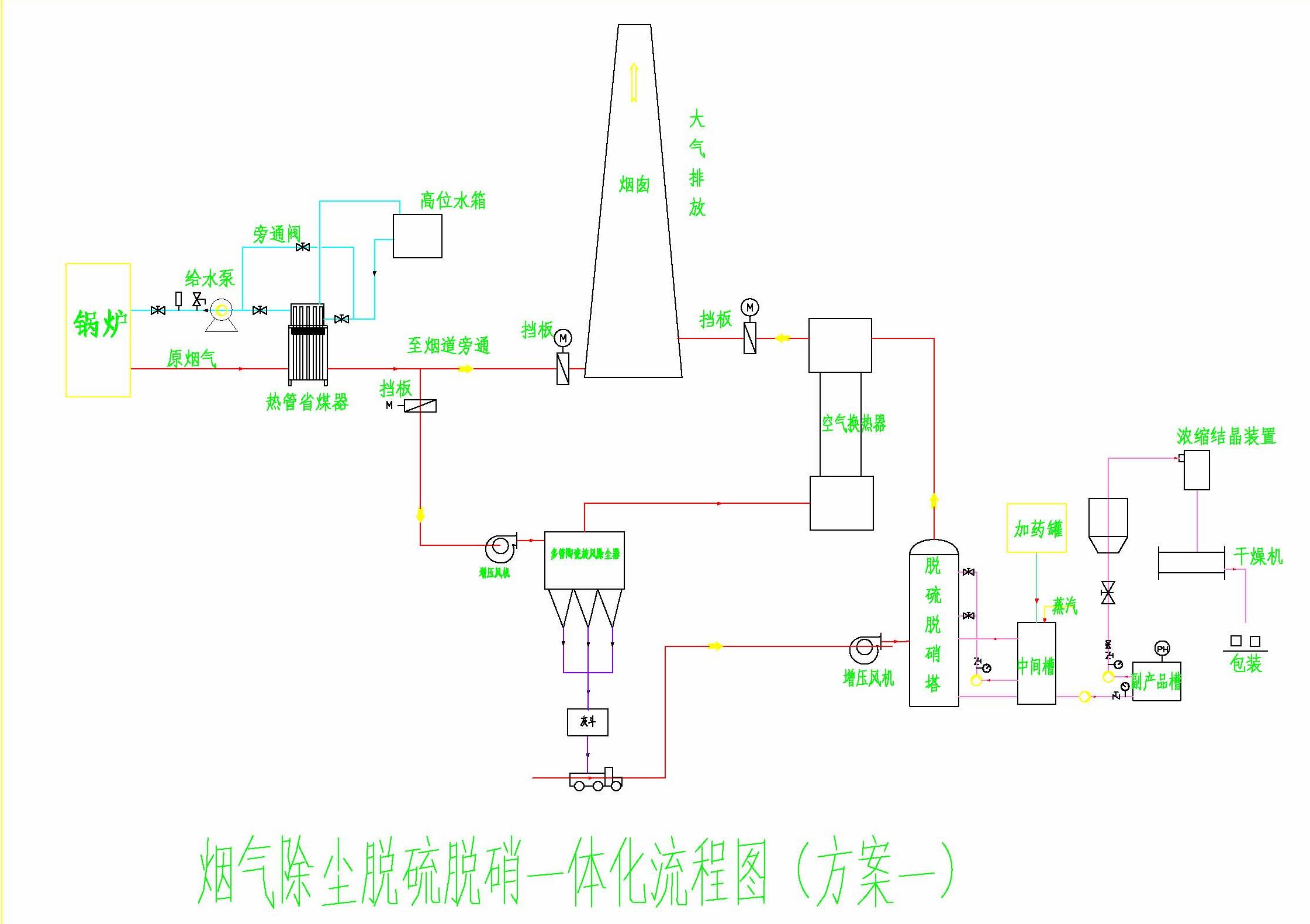 煙氣→余熱回收裝置(省煤器)→換熱器→除塵(根據(jù)情況確定)→脫硝脫硫除塵一體塔→換熱器→排放。(本流程僅供參考,我公司根據(jù)不同情況設(shè)計不同方案,但均以處理達標(biāo)、投資小、占地面積小、管理方便為宗旨)