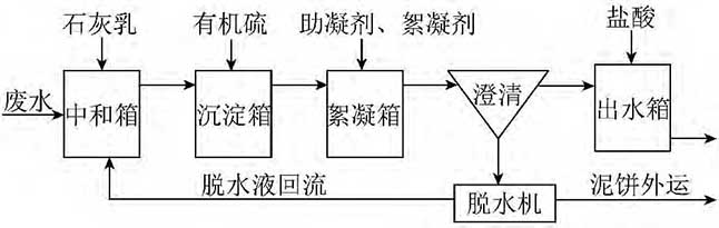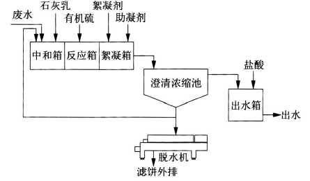 本處理系統(tǒng)包括:廢水池、清水池、混合反應(yīng)器、三聯(lián)箱、澄清器、壓濾機、各種加藥裝置等。