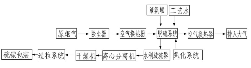 氨一硫酸按法脫硫工藝是用氨吸收劑吸收煙氣中的二氧化硫, 在吸收過(guò)程中,氨吸收液吸收SO2并生成亞硫酸銨與亞硫酸氫銨,經(jīng)壓縮空氣氧化生成硫酸銨, 再經(jīng)加熱蒸發(fā)結(jié)晶析出硫酸銨, 過(guò)濾干燥后得產(chǎn)品。
