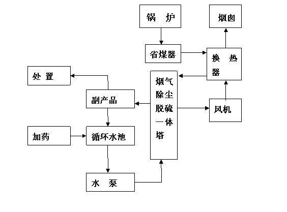 本方案設(shè)計流程:煙氣→余熱回收裝置(省煤器)→換熱器→脫硫除塵一體塔→換熱器→排放。(本流程僅供參考,我公司根據(jù)不同情況設(shè)計不同方案,但均以處理達(dá)標(biāo)、投資小、占地面積小、管理方便為宗旨)